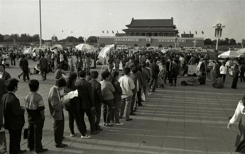 1992年,天安門廣場(chǎng)國(guó)營(yíng)照像點(diǎn)前排隊(duì)等候照像的游客。 張居生